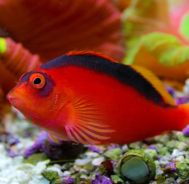 Chief.. little FlameHawkfish.Lacking swim bladder but his personality makes up to for it.He wont miss anything with his hawkeyes
